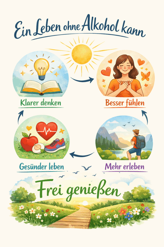 Ich habe die KI gebeten, für mich zum Abschluss des Textes eine positive Grafik zu erstellen. Sie gefällt mir wirklich gut: Ein Leben ohne Alkohol ist freier, bewusster und gesünder. Ich habe mich dafür entschieden, weil der frühe Tod meines Vater mich für mein Leben geprägt hat. Wünschen würde ich mir, dass viele Menschen die gleiche Entscheidung treffen. Mein Vater hat so viel verpasst. Erfolg im Beruf nach der Wende. Die glückliche Langzeitbeziehung mit meiner Mutter. Beide wären heute 60 Jahre verheiratet. Das Leben mit seinen Kindern, Enkeln und Urenkeln. Freies Reisen: Als DDR-Bürger hat er von der Welt nicht viel gesehen.