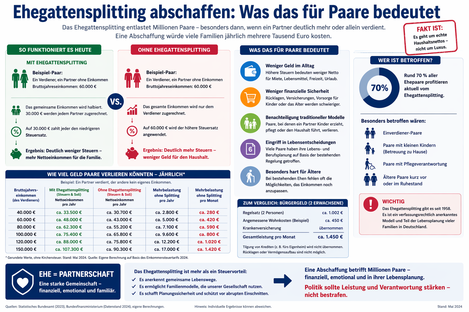 „Ich will das Ehegattensplitting abschaffen!“ Diese Worte sprach Vizekanzler Lars Klingbeil am 25. März 2026 bei einer Grundsatzrede in Berlin. Der Staat möchte der Wirtschaftskrise begegnen, indem die Bürger mehr arbeiten. In den Augen der Politik ist das Ehegattensplitting ein Anreiz, Teilzeit zu arbeiten oder gar nicht berufstätig zu sein. Doch stimmt das wirklich? Ich erkläre, was das Ehegattensplitting ist, und zeige an Beispielen, wie viel Geld Familien und verheiratete Paare sparen können. Und ich wage einen Ausblick was künftige Ehepaare erwartet.